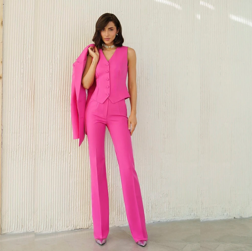Transform your executive presence with our Santa Croce Three Piece Suit Set – a bold statement of power dressing that refuses to be ignored. This audacious ensemble marries a sharp one-button jacket with perfectly tailored pants and a statement vest, creating a silhouette that commands attention. Daringly structured yet undeniably feminine, this suit defies convention while maintaining luxurious refinement.