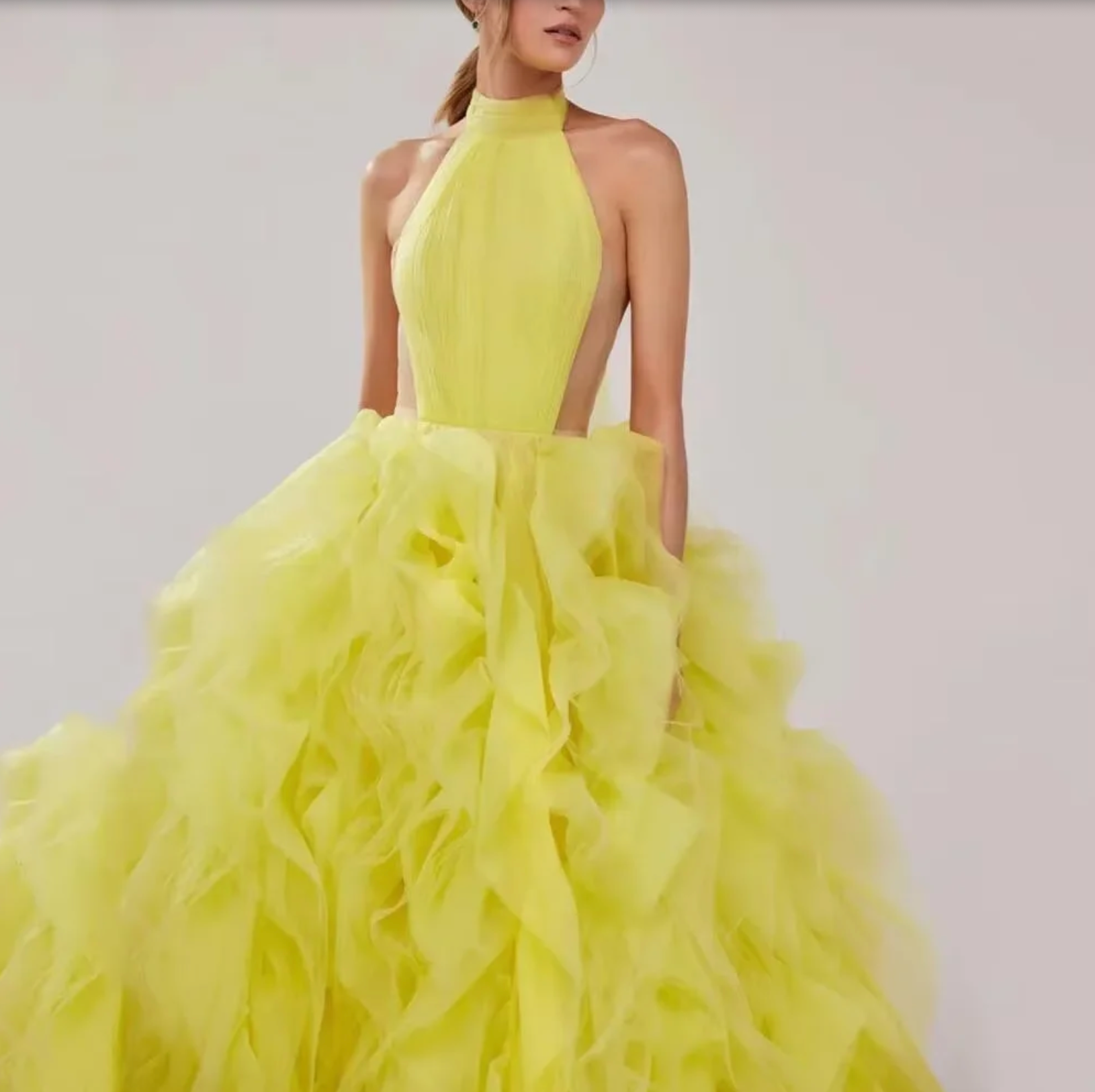 Its bold structure and unapologetic proportions forge a silhouette that refuses to blend in, made for those who consider distinction non-negotiable. Crafted from an intoxicating fusion of cotton, polyester, and satin, featuring a natural waistline, defiant sweep train, and a halter neckline that dares to bare—this isn't just evening wear, it's evening warfare.