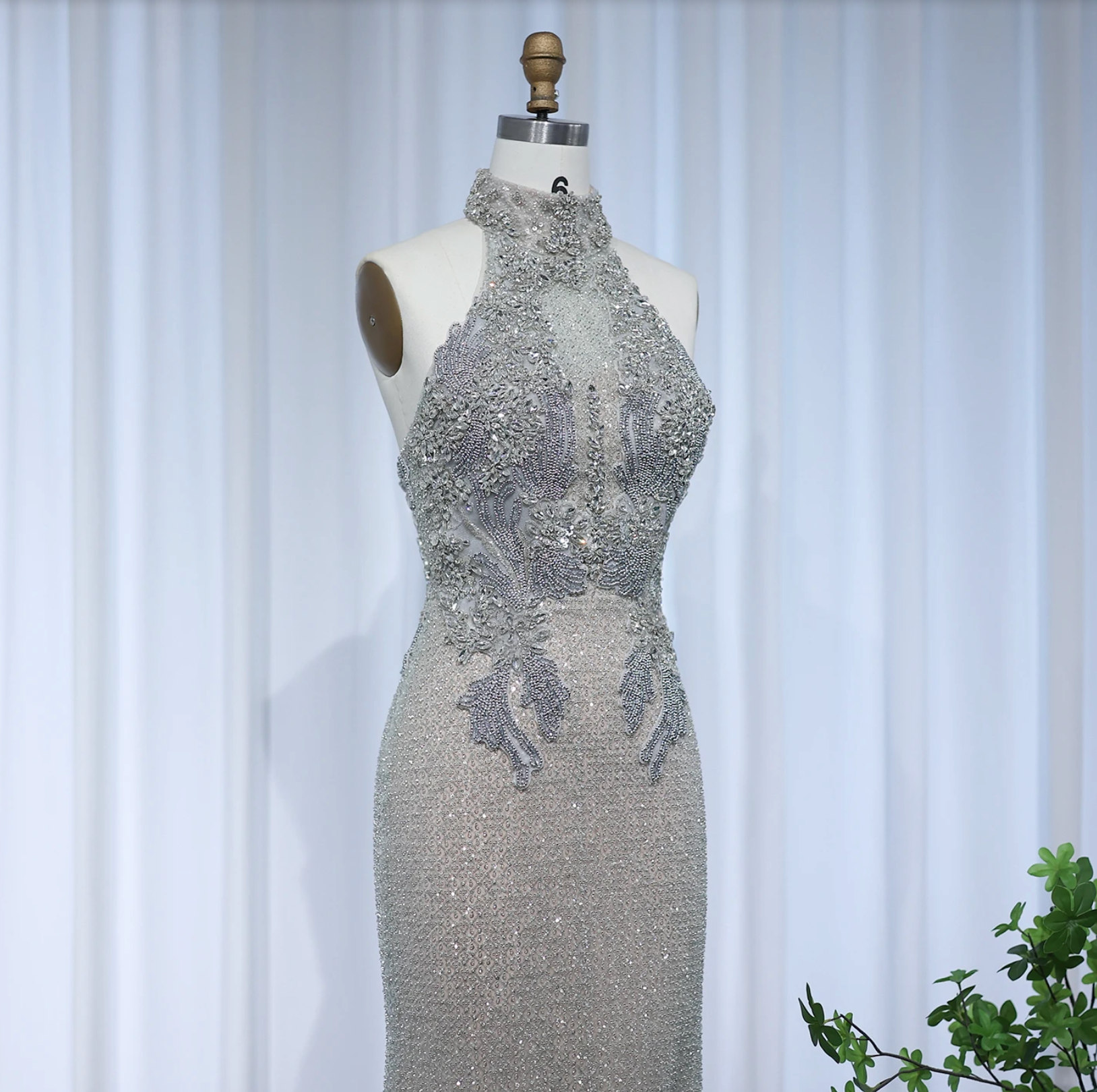 Own the night in the Moonflower Gown, a daring custom creation that radiates luxury. Featuring dazzling silver beading, crystals, and pearls, this sleeveless A-line gown stuns with a sensual halter neckline and a bold backless design. Crafted from tulle and polyester, its floor-length silhouette ensures you command attention and exude irresistible confidence at any formal event.