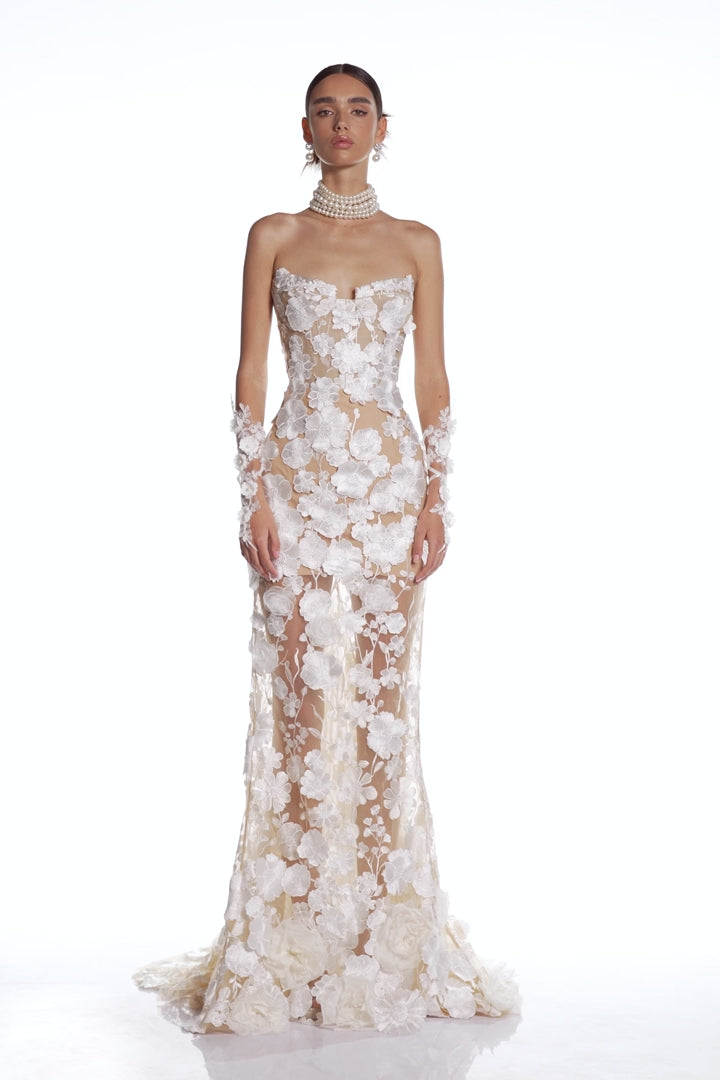 Tabarre commands attention with its audacious off-shoulder silhouette and intricate off-white lace appliqués that cascade down to the floor. This strapless formal gown features dramatic short sleeves and a striking tie-back detail that demands confidence. Perfect for the bride or evening guest who refuses to blend in—the floor-length cut and delicate flower lace create an unforgettable statement piece that balances elegance with bold, unapologetic style.
