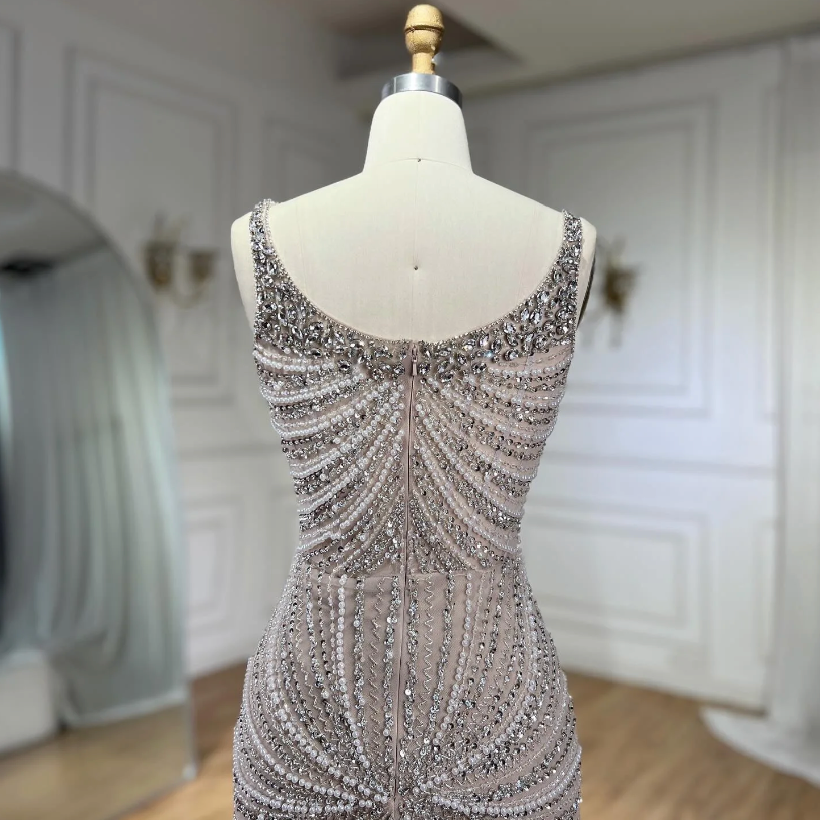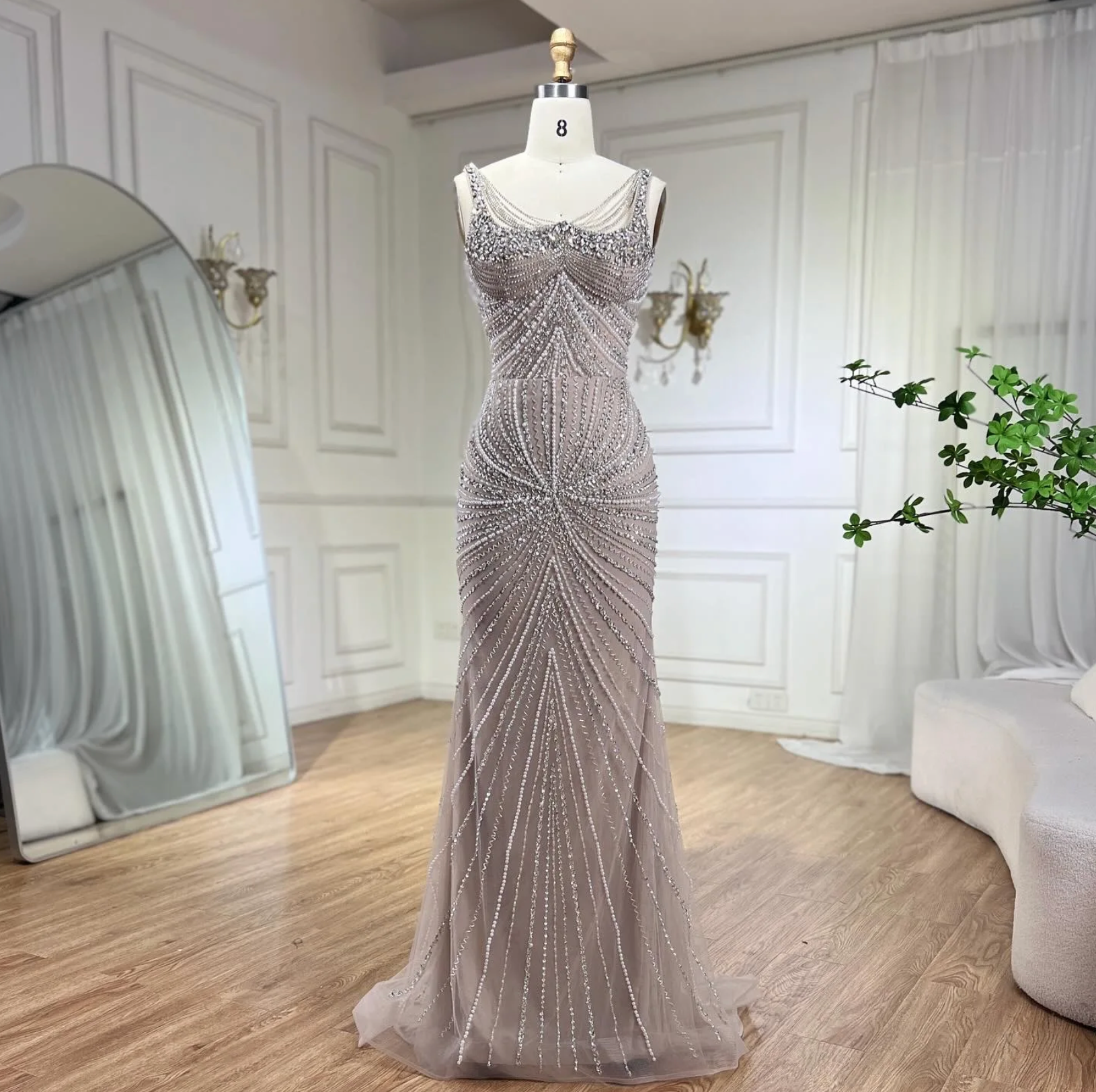 Embrace bold sophistication with the Arabian Nights Gown. This Arabic Nude masterpiece features a figure-hugging mermaid silhouette and slender spaghetti straps that highlight your shape. Adorned with hand-beaded crystals and sequins on luxurious polyester tulle, it commands attention with a sweeping train and striking square neckline. Perfect for making a fearless statement at evening events or weddings, this gown blends daring style with exquisite craftsmanship.