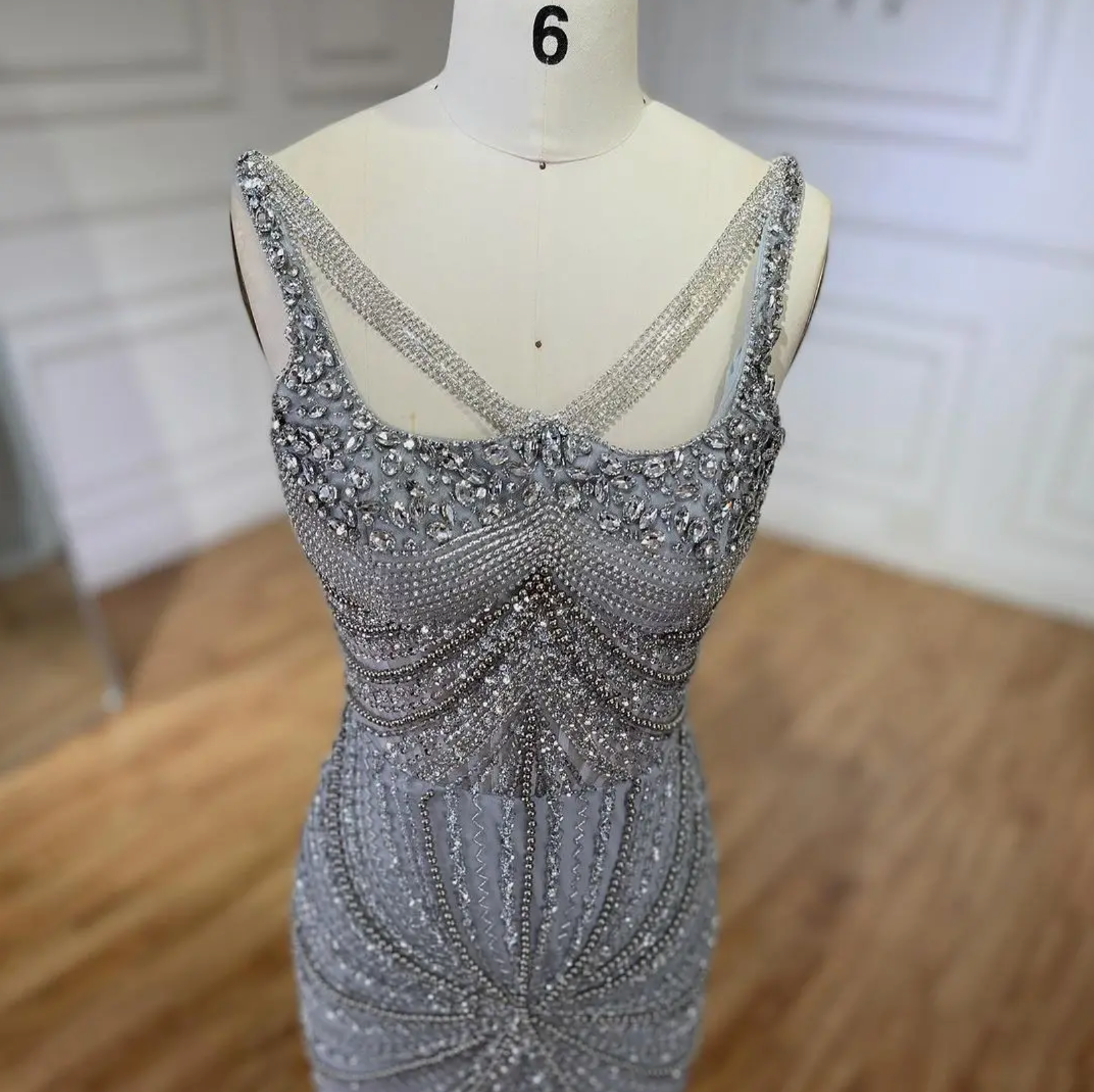 - Crystal, sequin, beading, polyester, tulle.