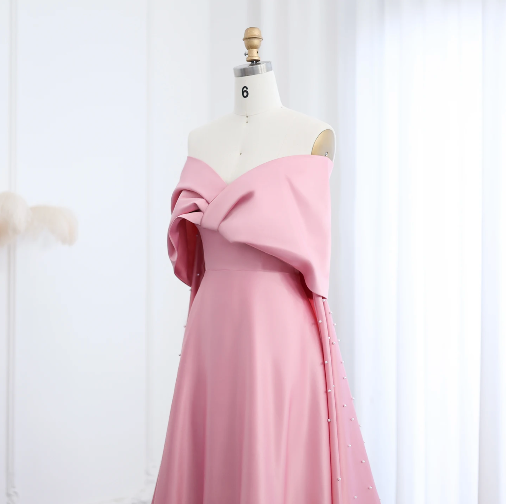 The Centenary Gown is a daring statement of luxury, crafted from Dubai pink satin with delicate polyester and tulle fabrics. Crystals, pearls, and intricate beading adorn this exquisite gown. It features an off-shoulder neckline, cap sleeves, and a natural waistline that flatters your silhouette. The exquisite court train adds dramatic flair, making this gown perfect for bold women ready to captivate at weddings or elegant parties.