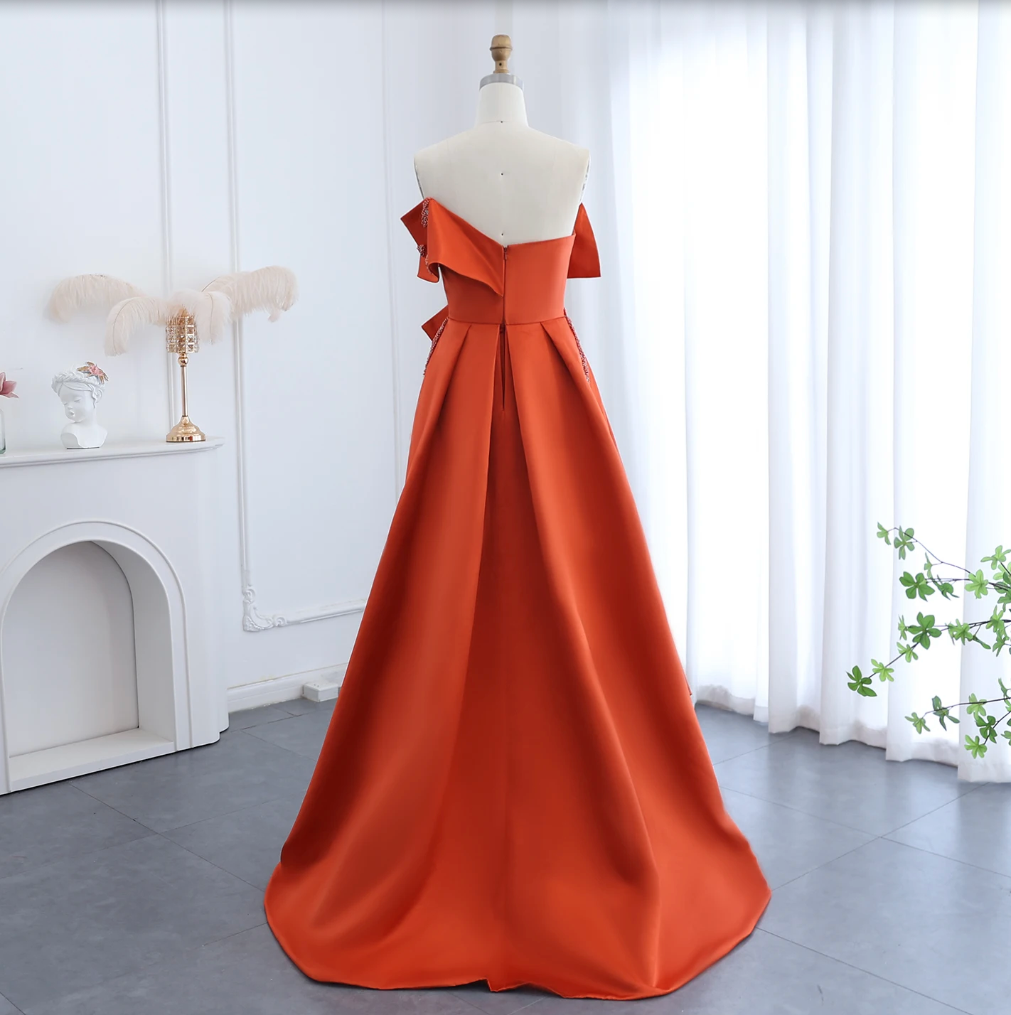 Make a bold statement in the Dahlia Gown, crafted from luxurious satin that gleams with every step. Featuring an off-the-shoulder A-line silhouette, this gown combines daring charm with timeless elegance.