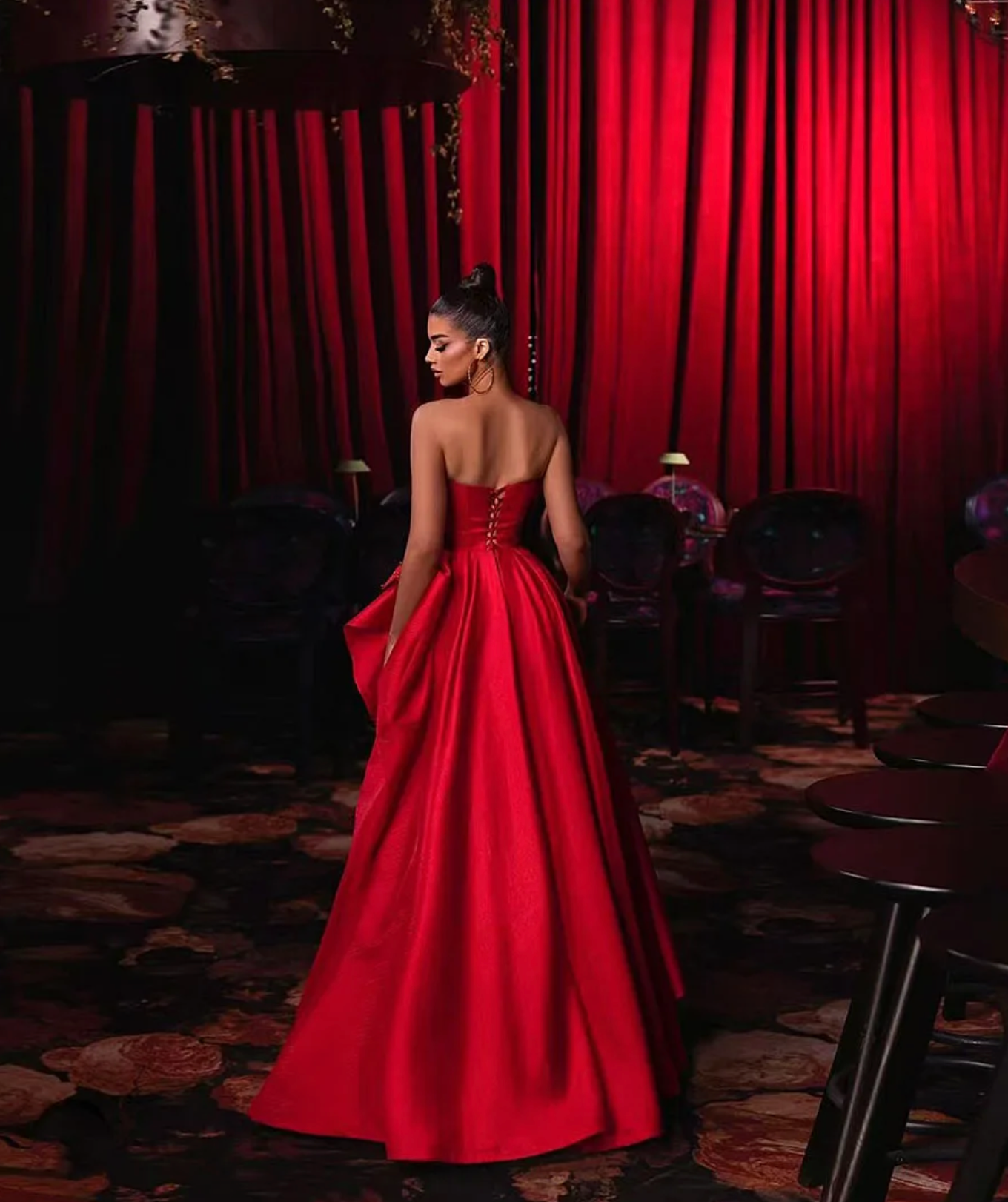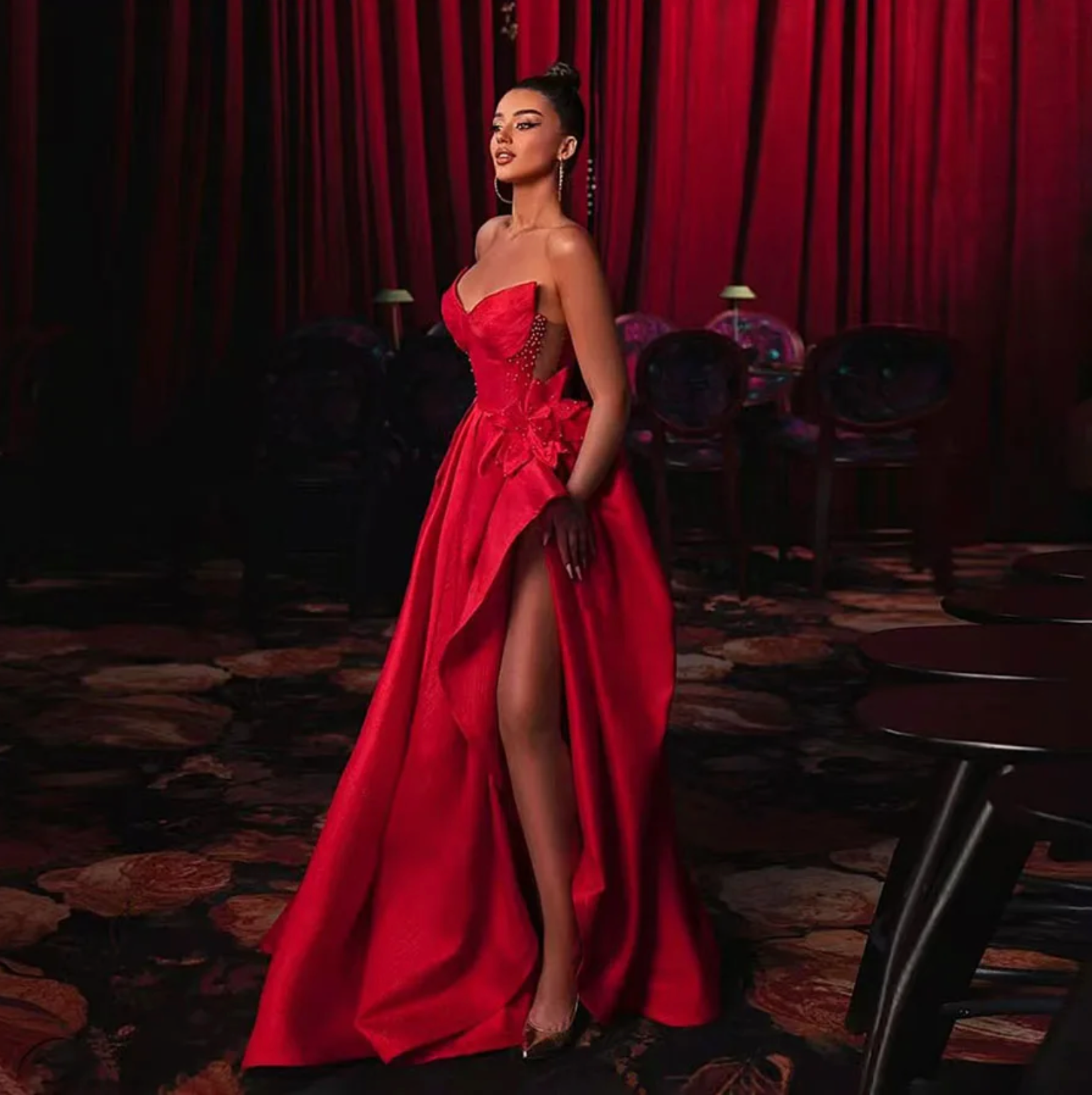 Crafted from luxurious satin, the fabric drapes with refined movement and luminous sheen. A tasteful slit at the hem provides modern movement while maintaining timeless grace. The floor-length cut creates a dramatic, show-stopping presence perfect for prom, black-tie galas, or formal celebrations. This couture-inspired piece combines classic bridal sensibilities with contemporary styling—ideal for the discerning guest who refuses to compromise on quality or design.