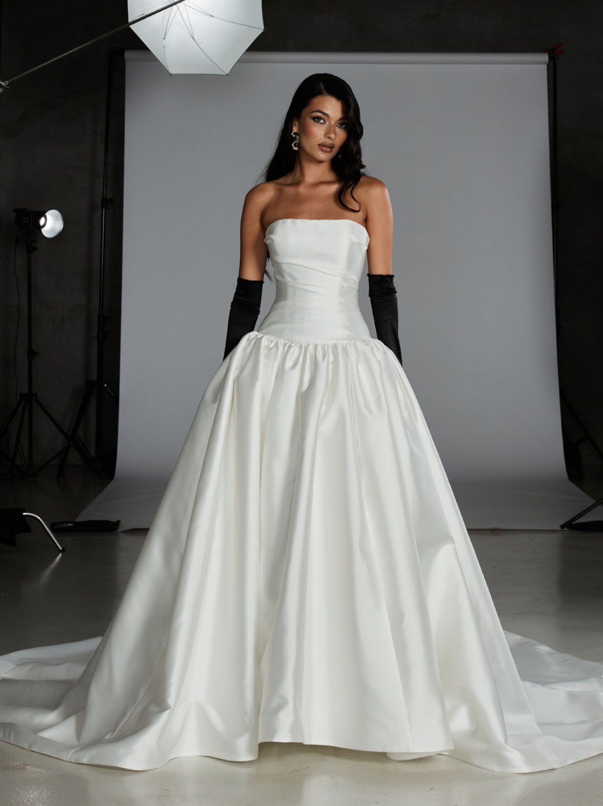 The Florence Ball Gown commands attention with its fearless silhouette. Crafted from sumptuous Mikado fabric, the strapless bodice features strategic ruching that sculpts and flatters, while the drop waistline creates an exaggerated hourglass that refuses to apologize. The voluminous skirt sweeps dramatically from the cinched waist, delivering the kind of unapologetic glamour that turns heads. For those bold enough to own the room.