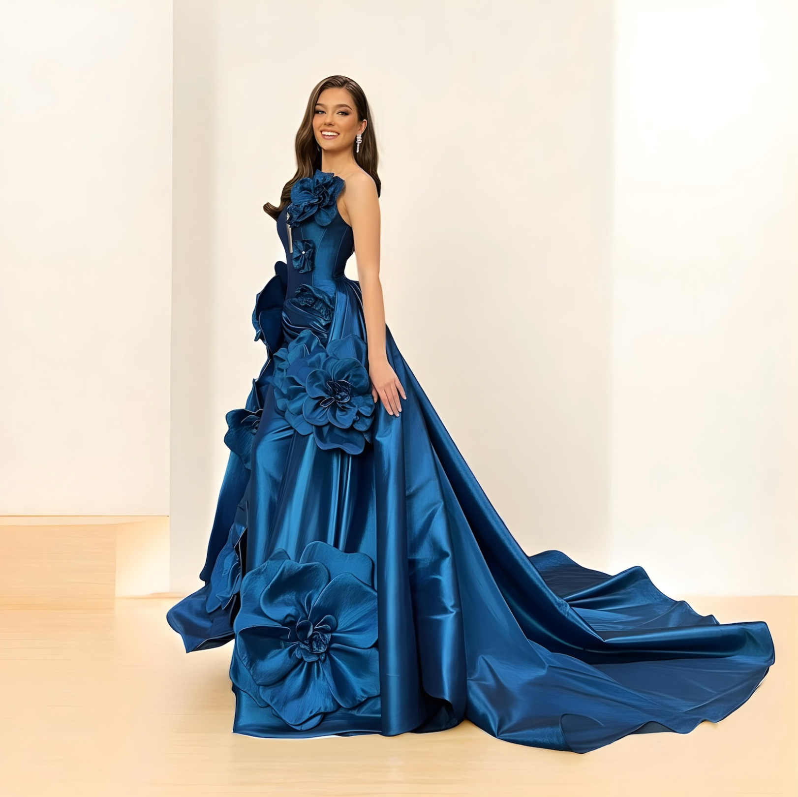 Make a statement in this audacious deep teal Hristo Botev gown that commands attention from every angle. The strapless bodice plunges daringly while oversized 3D floral appliqués add sculptural drama across the silhouette.