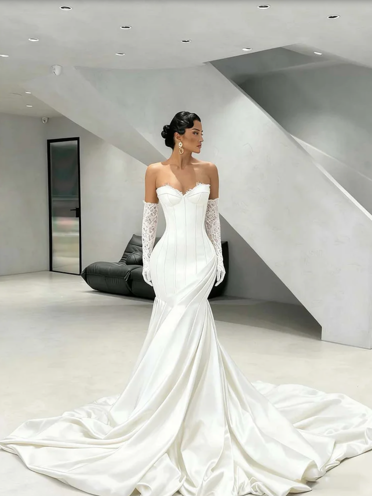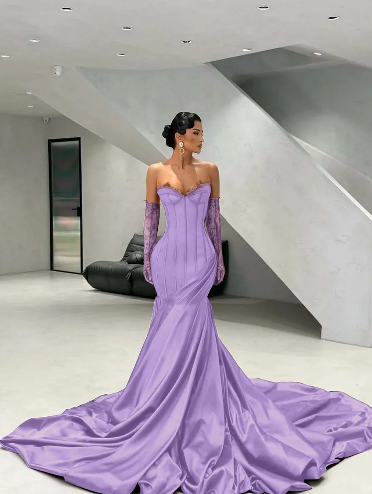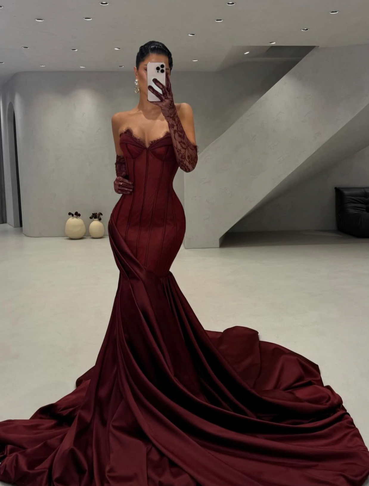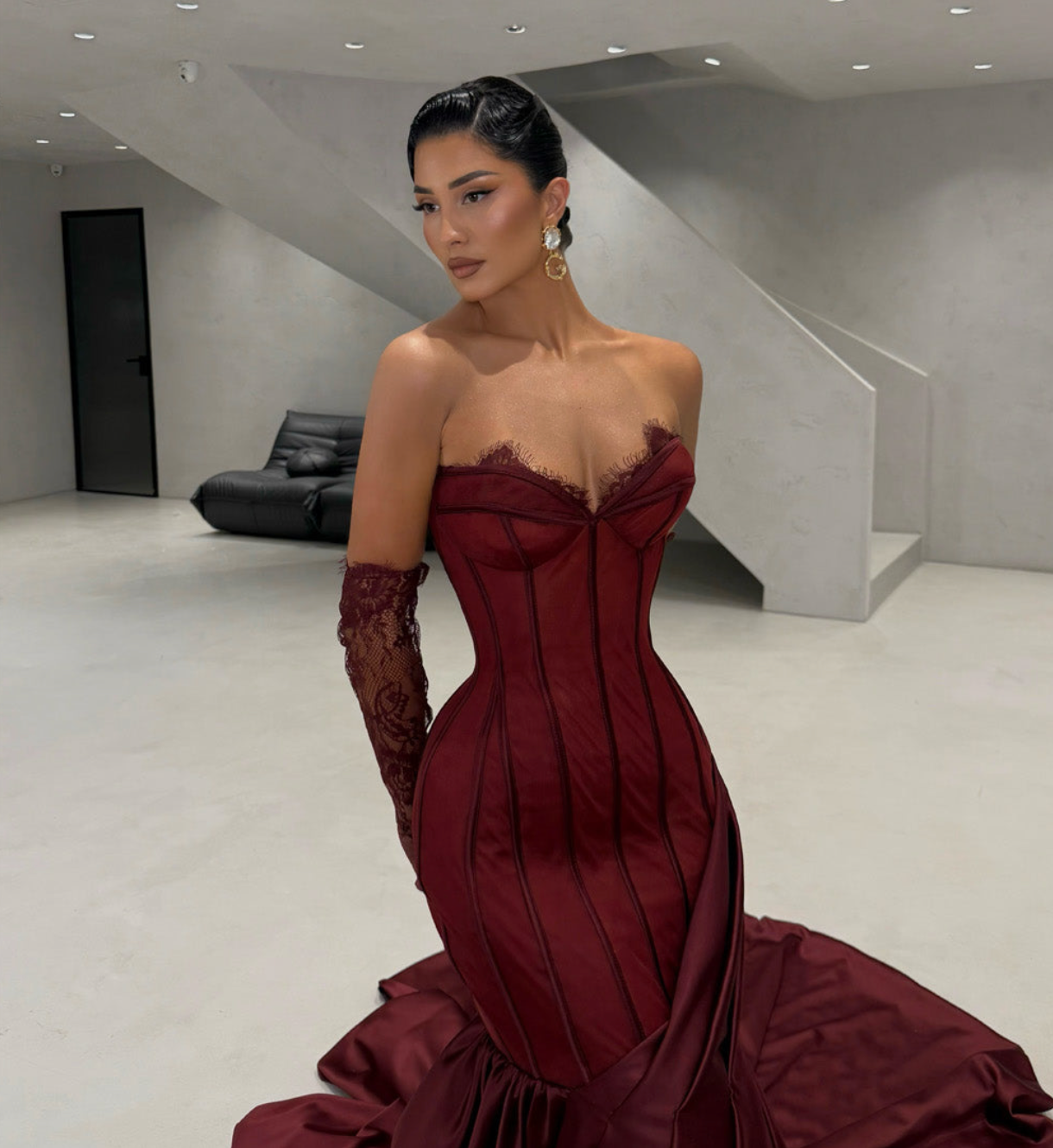 Ignite your presence in this audacious burgundy satin corset gown that commands attention. The sweetheart neckline frames delicate lace detailing, while sculpted side draping accentuates your silhouette with bold confidence. This gown features a dramatic floor-sweeping train that announces your arrival. Perfect for those who refuse to blend in.