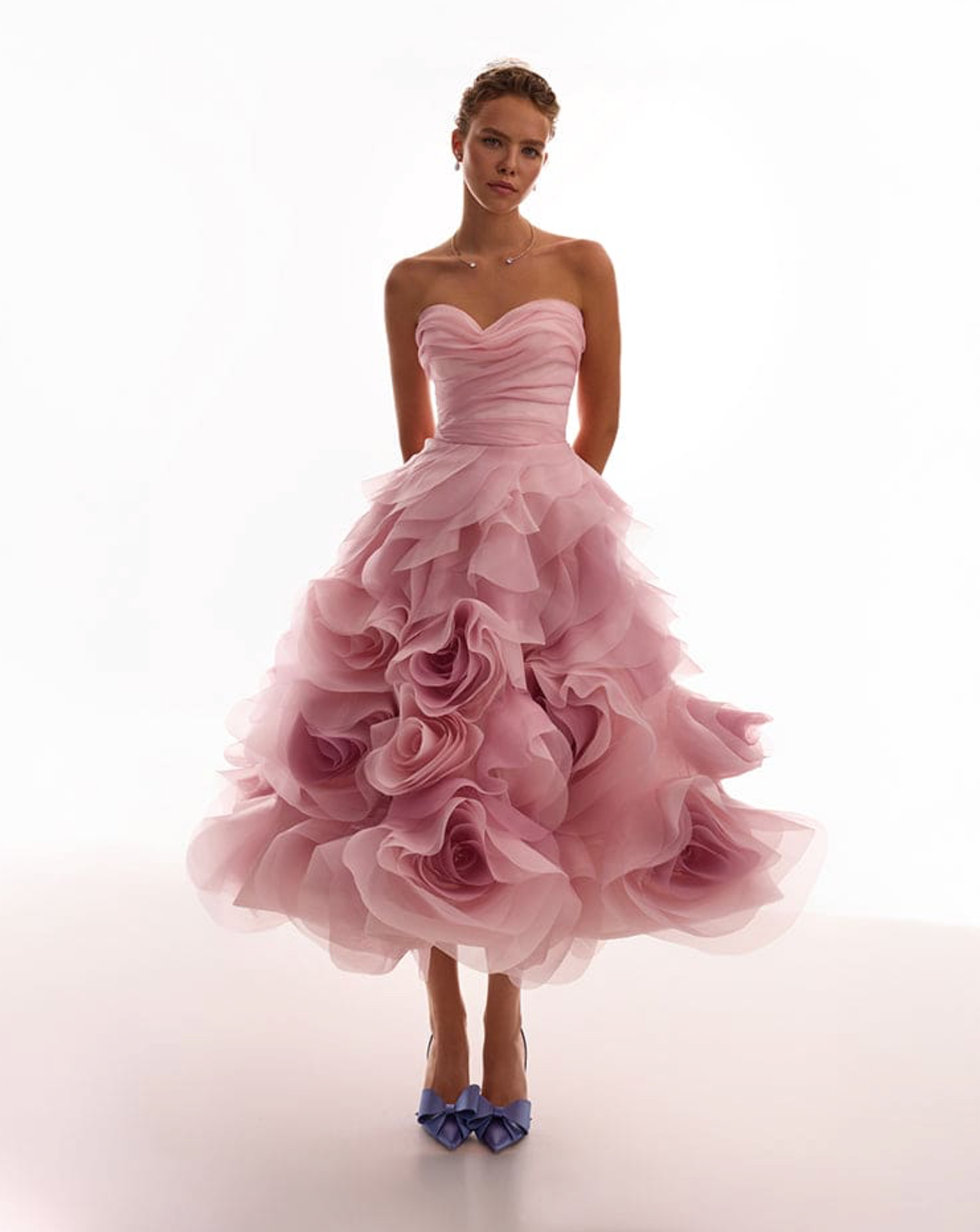 The voluminous skirt bursts from the waist, lavishly decorated with handcrafted 3D organza flowers and ruffles, ensuring you stand out at every soirée. This dress is the ultimate statement of elegance and fearless style.