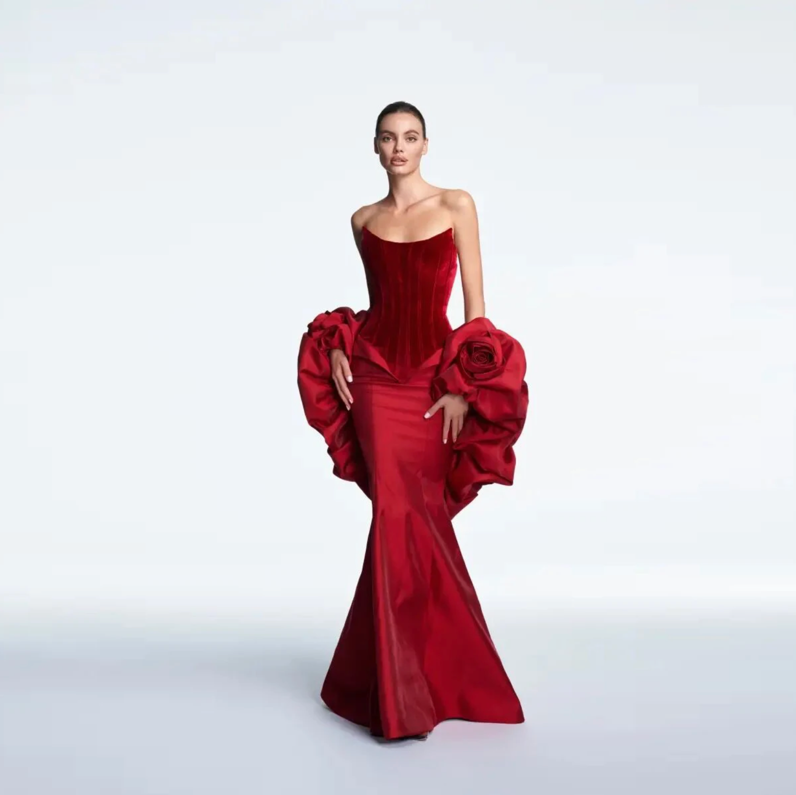 Unleash your inner goddess in Ruby, a strapless mermaid gown that commands attention. This Ruby beauty features a sculpted corset bodice with intricate lace-up detailing and a sleeveless design that showcases your shoulders. Cascading ruffles and delicate floral embellishments flow down the floor-length silhouette, creating an unforgettable mermaid curve. It suits brides and formal events that refuse to blend in, delivering haute couture boldness wrapped in elegance.