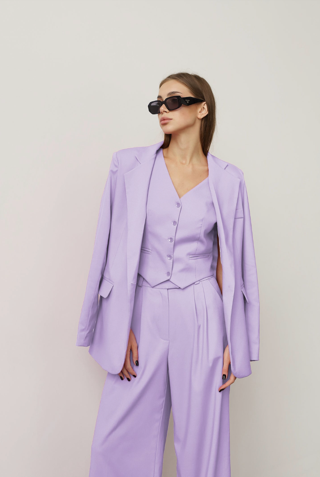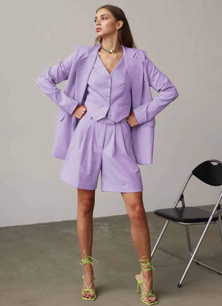 Embrace bold sophistication with The Stanley Suit Set. Enjoy the luxury of the three-piece outfit featuring a loose-fit single-breasted blazer. It has a matching vest, wide-leg pants, and a zipper fly. Designed with a sharp collar and buttoned details, this suit offers a fearless blend of style and comfort, perfect for the modern office woman ready to make a statement.