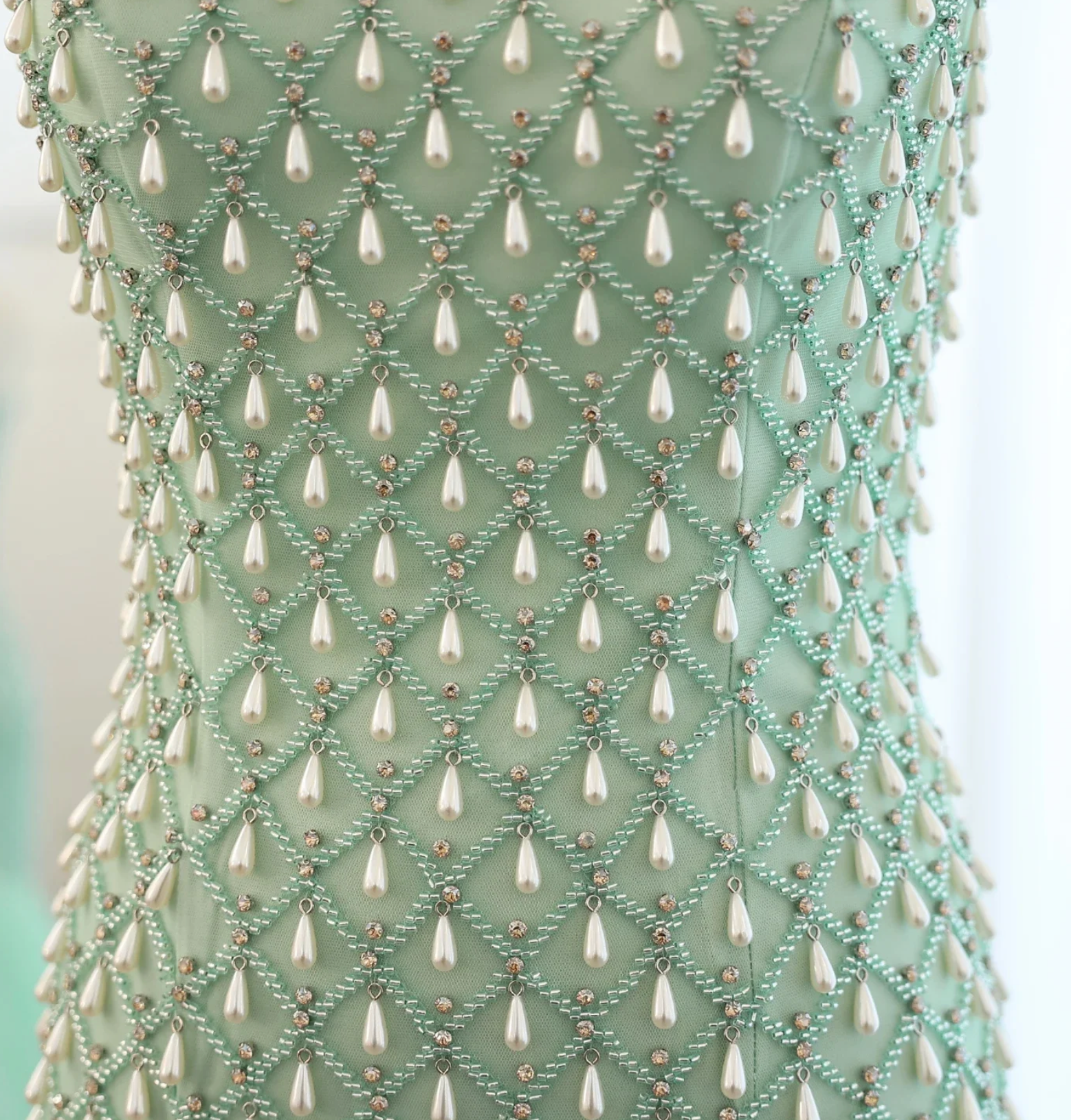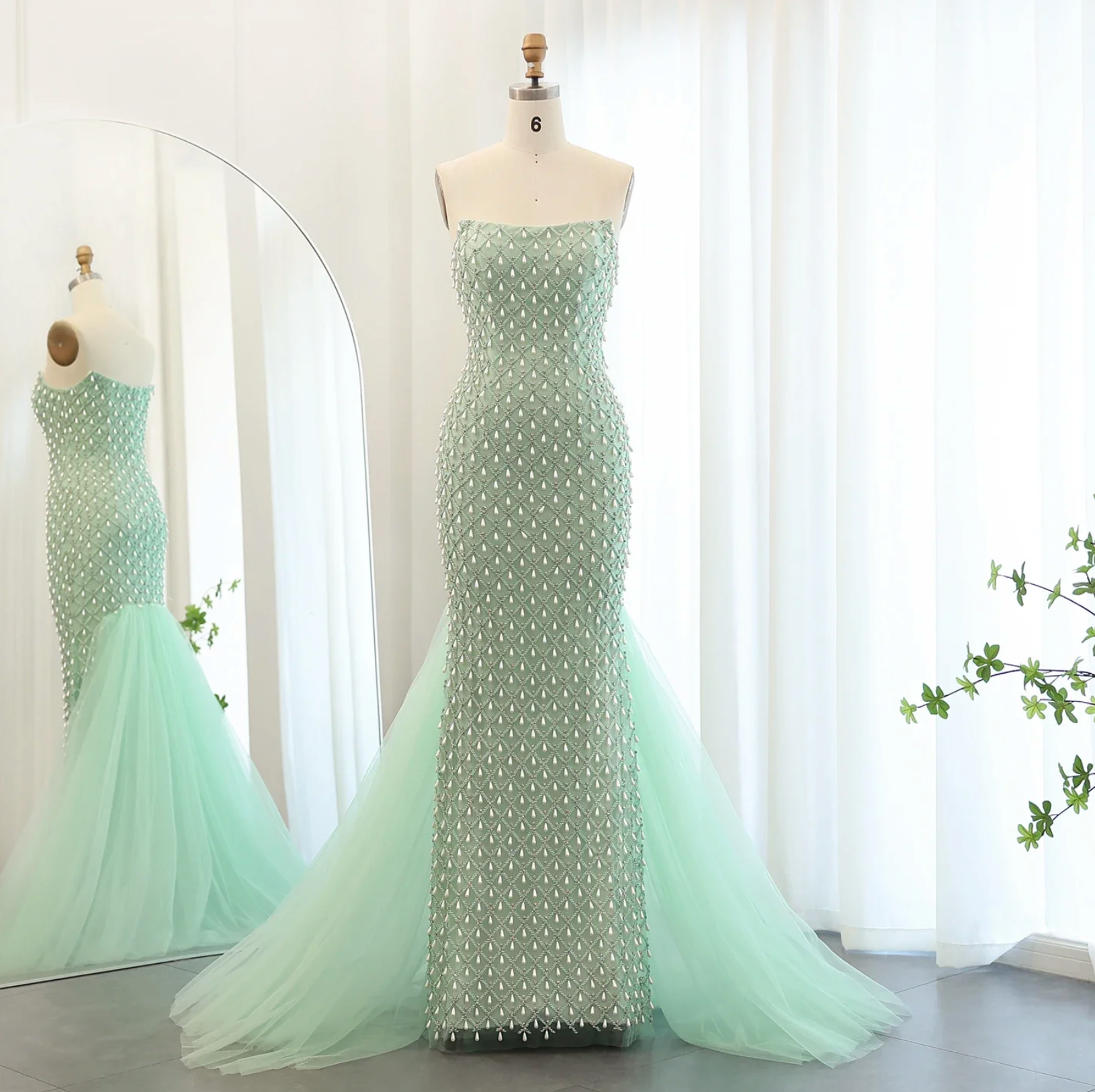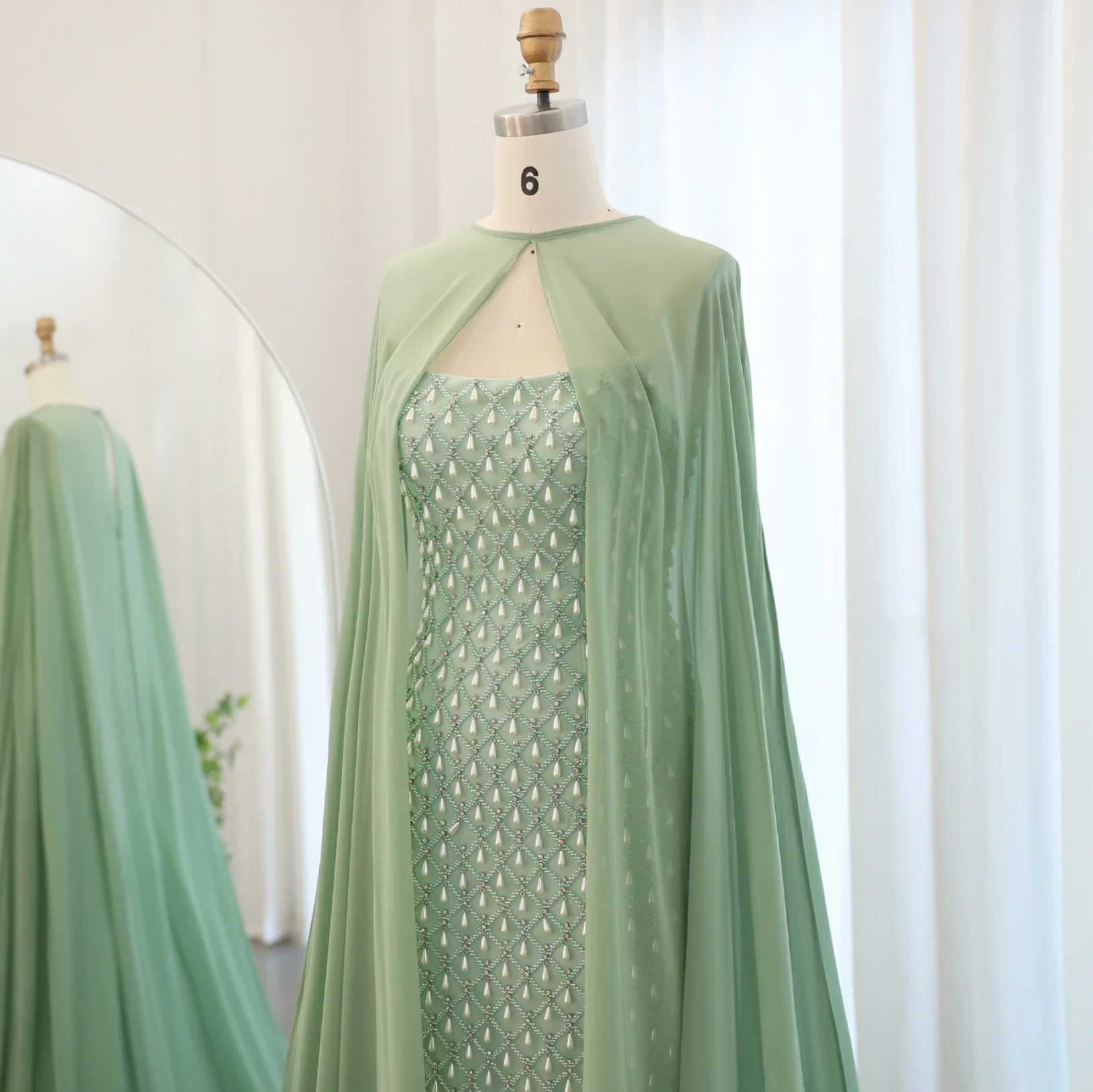 Make a stunning entrance in the Traniva Gown, a daring sage green mermaid evening dress designed to captivate. This strapless masterpiece features intricate beading, crystals, pearls, and sequins that shimmer with every move. Crafted from delicate tulle, it hugs the natural waistline and flows into a dramatic sweep train, complemented by an elegant cape. Perfect for weddings or grand parties, this gown embodies bold sophistication and unforgettable glamour.