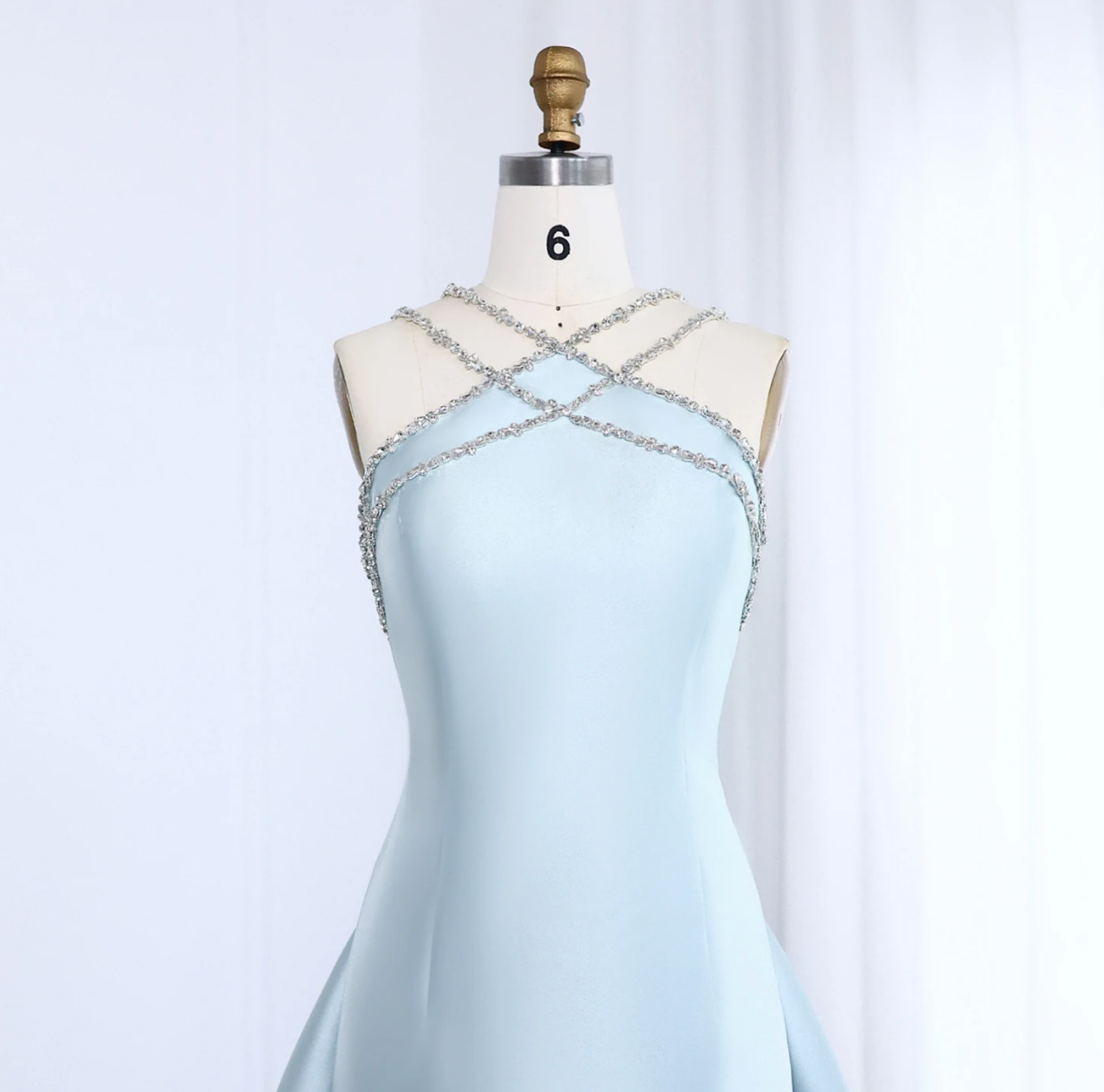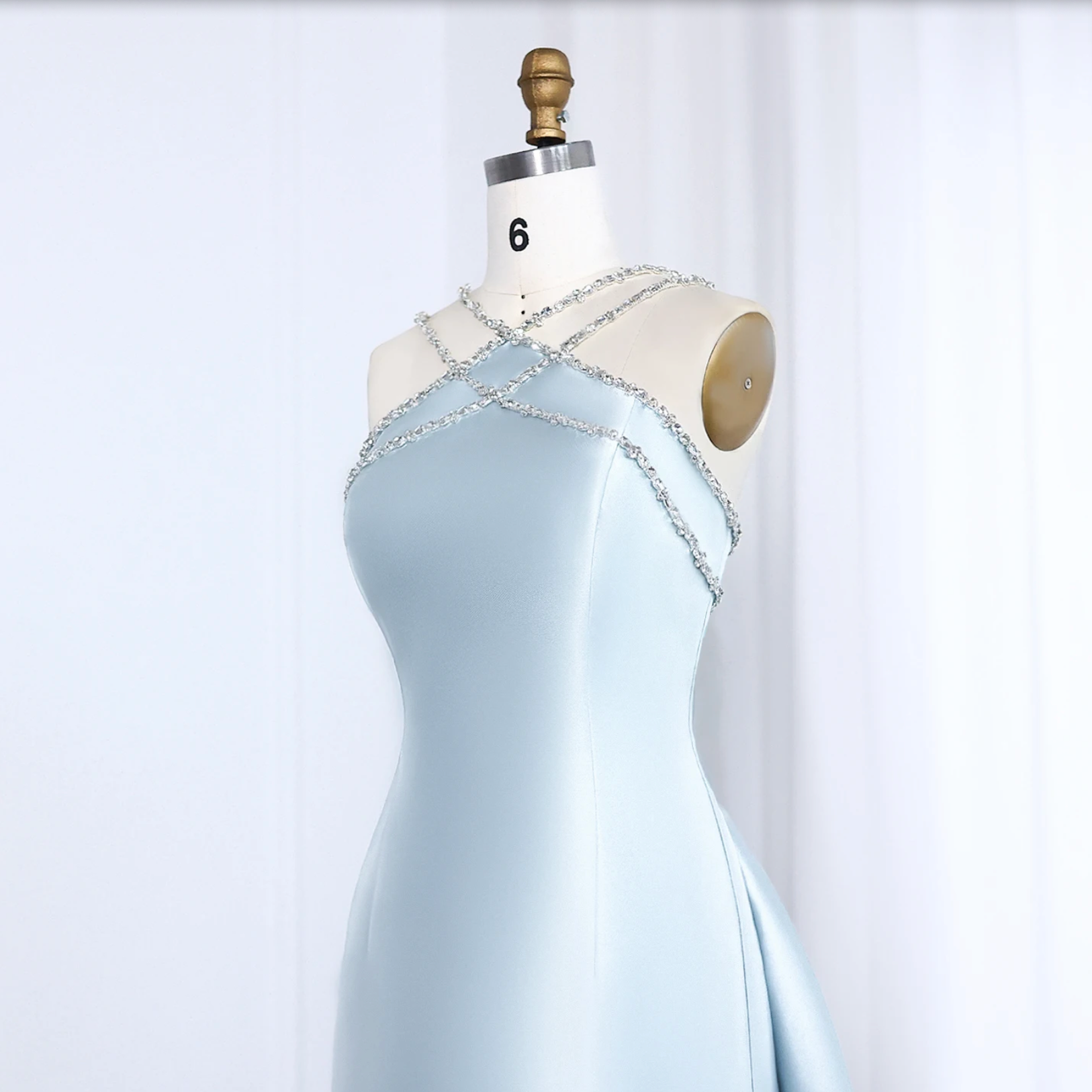 Dominate the night in our Via de la Salaria Formal Evening Gown—a light blue satin rebellion against boring formalwear. This Arabic-inspired creation doesn't just invite admiration; it commands it. The Evening Gown has an audacious overskirt that transforms your silhouette into a weapon of mass seduction. The trumpet/mermaid cut hugs your curves with shameless precision, while beading and crystals catch the light with every provocative movement.