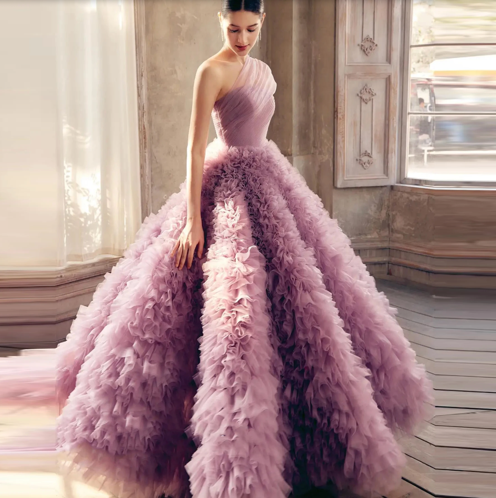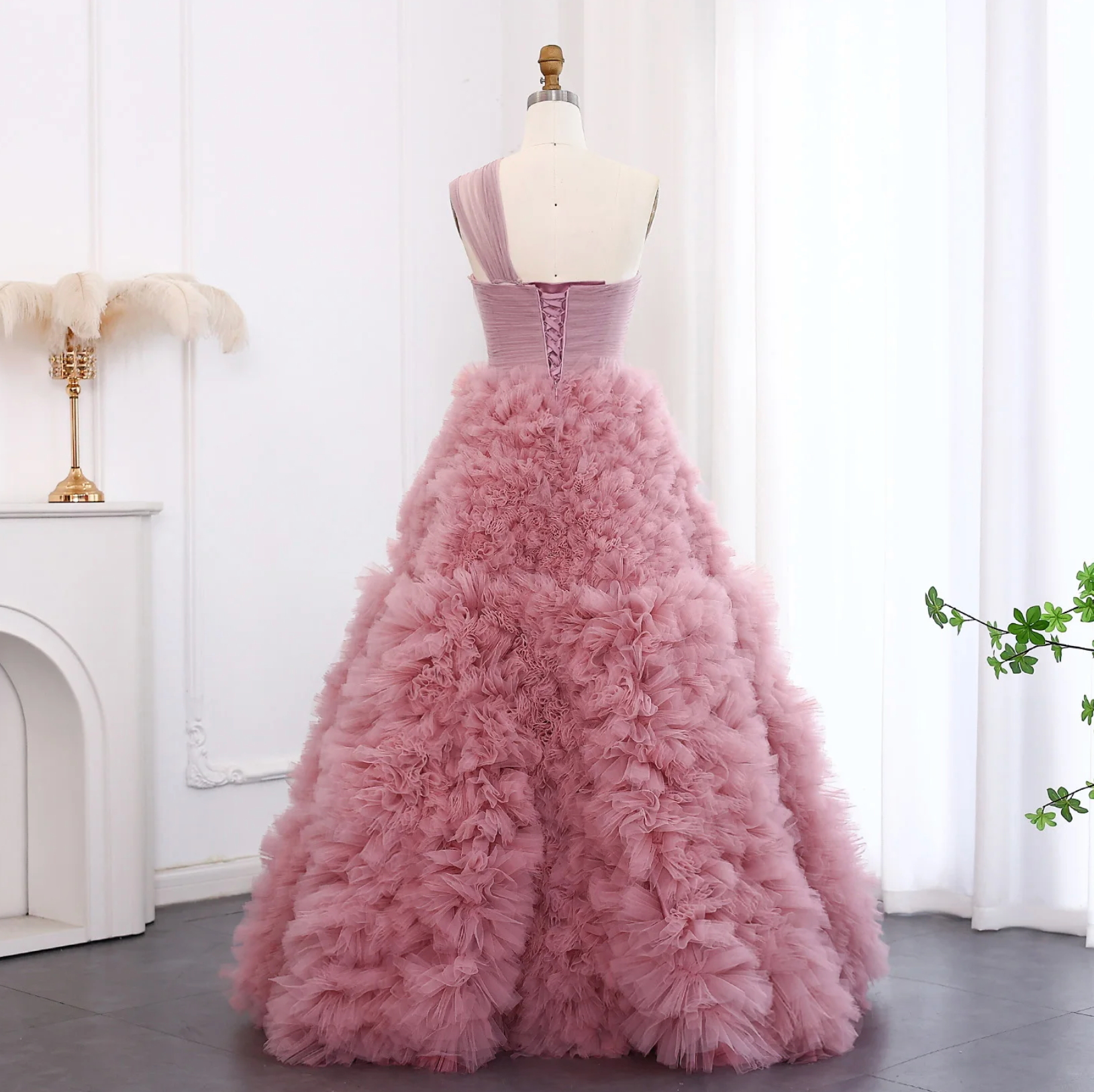 Make a bold entrance in the Whisperwind Gown, a daring take on classic elegance. This Dubai-inspired ball gown showcases ruffled tulle tiers, a striking one-shoulder silhouette, and intricate pleated details. Designed with a built-in bra and crafted from polyester, its floor-length A-line shape combines comfort with fearless style. Perfect for commanding the room and embracing your inner royalty at any formal event.